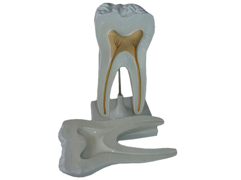 Modelul reprezinta un molar inferior gigant cu doua radacini, in sectiune axiala detaliind camera pulpara si canalul pulpar. Pe stativ, detașabil în 2 părți. Material – plastic rigid.