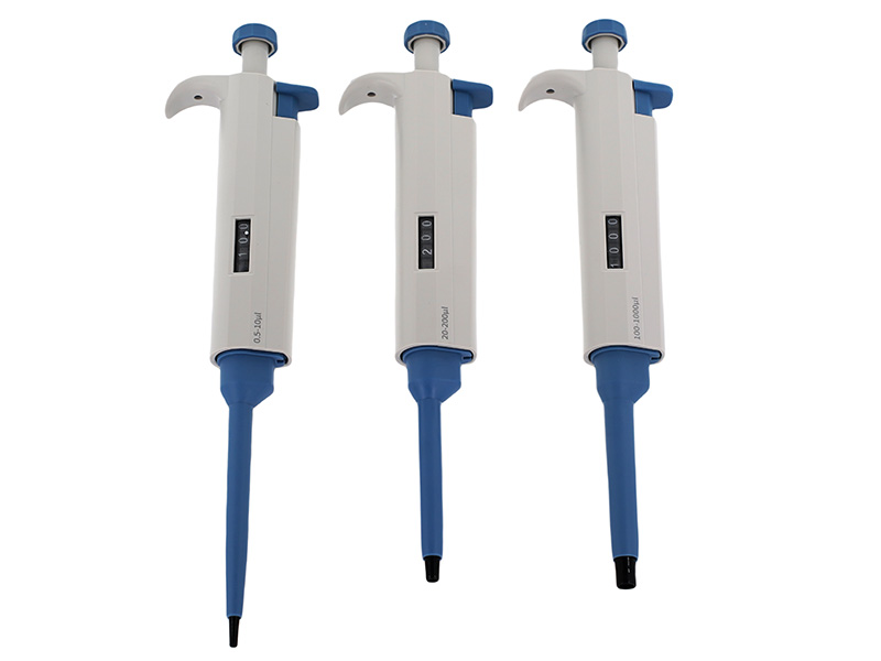 Set trei micropipete pentru a măsura și transfera volume mici de lichid în intervale: 10–100 µl, 100–1000 µl, 500/1000–5000 µl (microlitri).