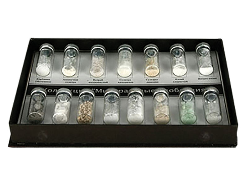 Colecția din 15 tipuri de îngrășăminte minerale este utilă pentru demonstrații la lecțiile de chimie, geografie, biologie și tehnologie. Fiecare specimen este etichetat și ambalat în fiolă de sticlă transparentă. Conținut: carbamid, azotat de amoniac, natriu acid azotic, azotat de calciu, sulfat de amoniu, clorură de potasiu, salpetru, superfosfat dublu, amofos, diamofos, nitrofos, nitroamofos, pulbere de dolomit, sulfat feros, sulfat de magneziu.