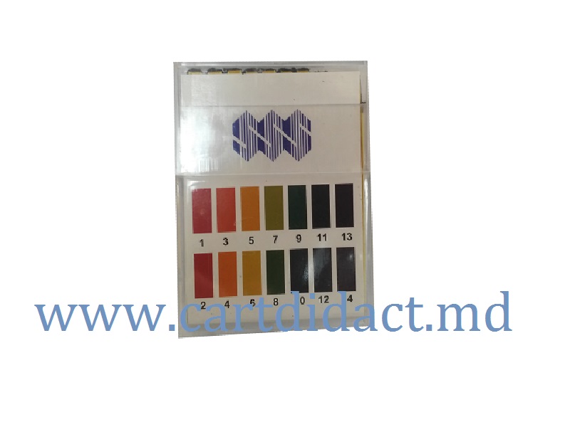 Hartie indicatoar de pH. Notare universală - pH de la 1 la 14. Diagramă pH color de la 1-14 în fiecare pachet. Modificarile de culoare de pe benzi trebuie comparate cu diagrama colorata dupa aproximativ 15 secunde de la contactul cu substanta respectiva. Pachet cu fășii (strips-uri, 6 x 1 cm) sau rolă.