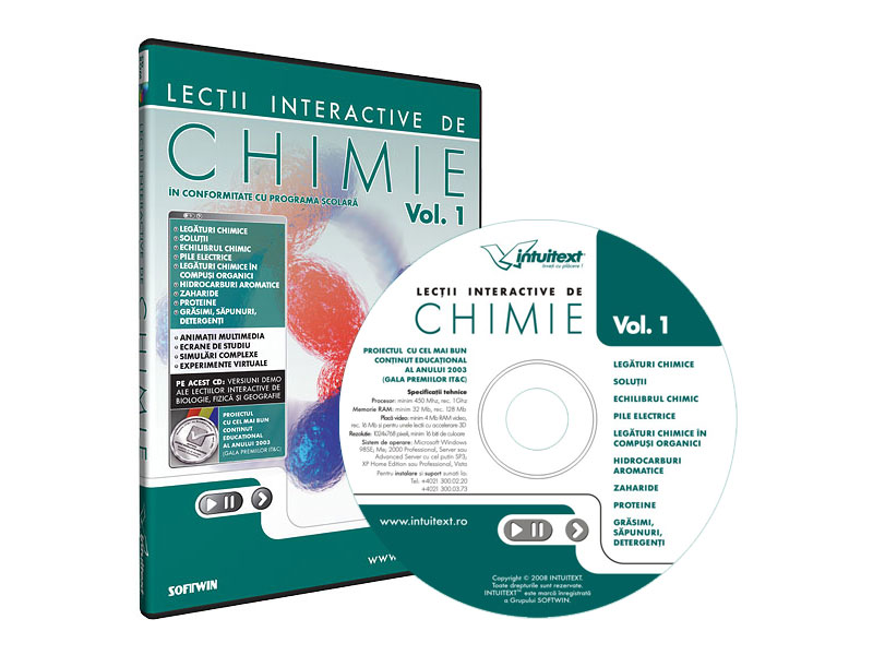 Lecţii Interactive de Chimie – Vol. I ajută la reprezentarea globală şi corectă a proceselor şi fenomenelor chimice, de la modificările vizibile cu ochiul liber la interacţiunile la nivel molecular şi atomic, oferind un real suport în predarea: Legăturilor chimice; Soluţiilor; Echilibrului chimic; Pilelor electrice; Legăturilor chimice în compuşi organici; Hidrocarburilor aromatice; Proteinelor; Zaharidelor; Grăsimilor, săpunuriilor, detergenţilor.