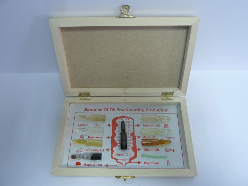 Setul reprezintă schema procesului de extracție și procesare a petrolului, până la obținerea derivatelor acestuia (benzină, cherosină, combustibil ușor, uleiuri, lubrifianți, parafină etc ). Sunt prezentate eșantioanele produselor, pentru a fi cunoscute și de către elevi.