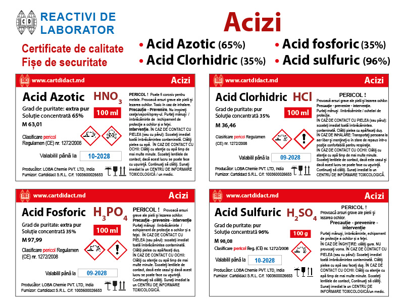 Acid azotic (65%), Acid clorhidric (35%), Acid fosforic (35%), Acid sulfuric (96%). Grad de puritate: reactiv pur. Masa substanței: 200 g. Ambalaj: flacon din sticlă de culoare cafenie. Capac de masă plastică, filetat. Etichetă. Certificat de calitate.