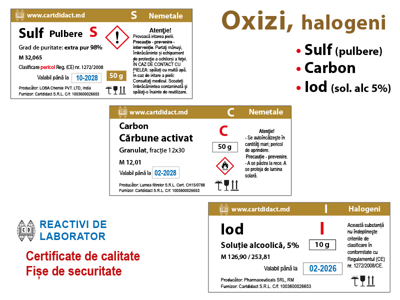 Sul, Carbon, Iod. Grad de puritate: reactiv pur și extra pur. Masa substanței: 50g (Iod – 10 g). Ambalaj: flacon din sticlă de culoare cafenie. Capac de masă plastică, filetat. Etichetă. Certificat de calitate.