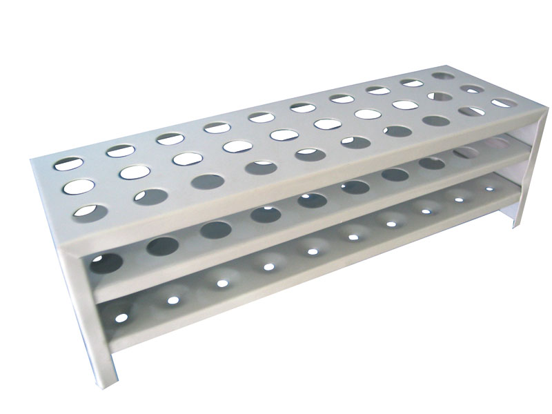 Stativ pentru eprubete, dreptunghiular, cu suport plin, capacitate: 20-30 eprubete. Din aluminiu, d - găurii: 18-20 mm