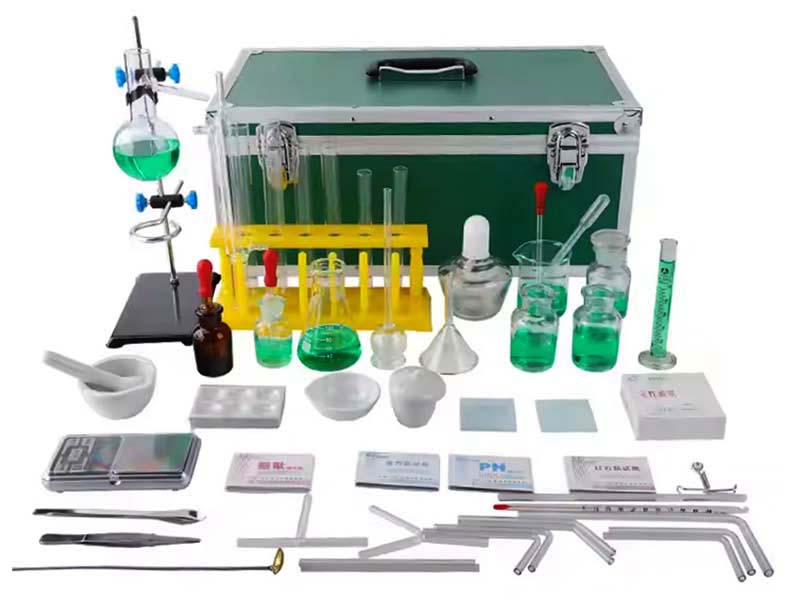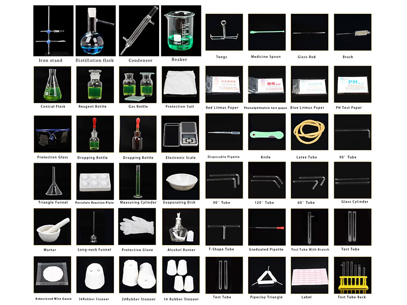 Conținut - 60 titluri componente pentru realizarea a peste 20 de experimente variate: filtrare, evaporare, reflux, titrare, reacții chimice etc.: tuburi și eprubete de diverse dimensiuni, pahare și baloane pentru fierbere, coloană de distilare și pâlnii cu dopuri, clește, tuburi în formă de U, cilindri graduați, stativ cu accesorii etc. Sticlărie este fabricată din sticlă borosilicată rezistentă la temperaturi înalte.