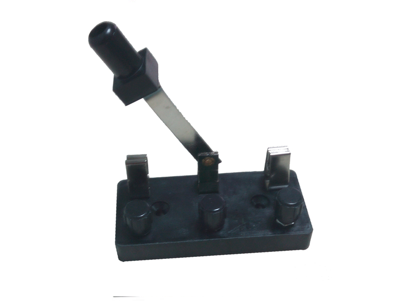 Placa cu intrerupator tip “comutator“ cu trei borne pentru conectarea fierelor conductoare. Dispozitiv pentru închiderea sau deschiderea rețelei prin care trece un curent electric sau pentru schimbarea direcției lui. Suport din plastic 4 x 7 x 1 cm, cu contacte dotate cu cleme cu piuliță izolata electric cu diametrul filetului de 4 mm, cu contactele la vedere confecționate din cupru cu dimensiunile 6 x 3 mm.