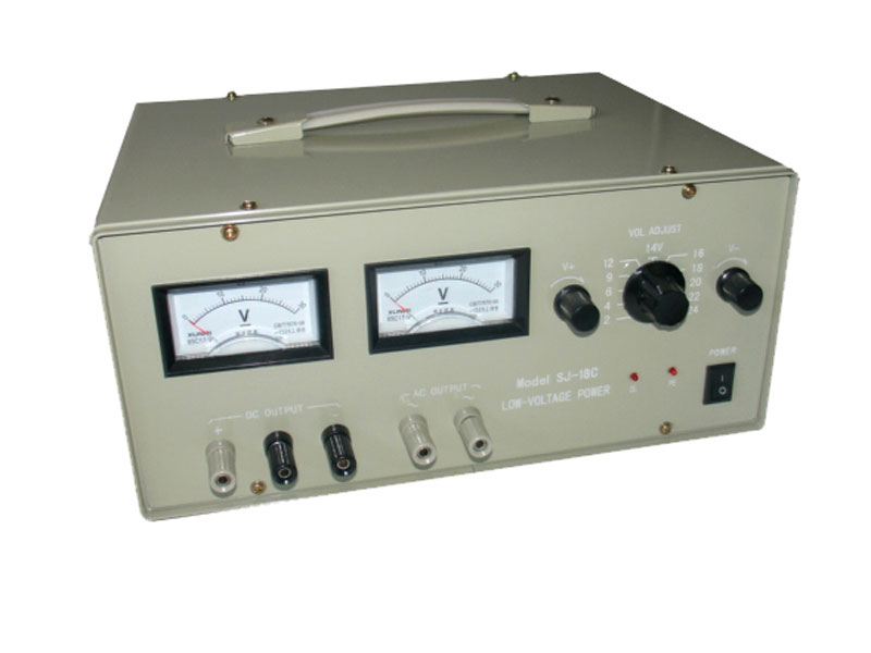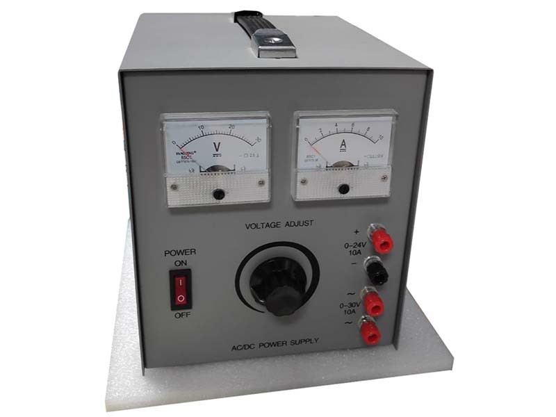 Aparat pentru alimentarea circuitelor electrice cu curent alternativ şi continuu. Sursă de tensiune, alternativă (două borne) și continuă (alte două borne), reglabilă de la 2 la 24 V, gradat, curent maxim 5 A, cu protecție la scurtcircuit. Fișa de conectare la rețea cu conductor pentru conectarea la pământ. Tensiune de alimentare 220 V. Voltmetru și ampermetru pentru indicarea tensiunii și curentului.