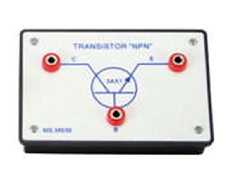 Unitate demonstrativă de tranzistor NPN, montat pe o bază de plastic, cu prize pentru contacte de 4 mm, cu schema de circuit imprimată. Curent de colector maxim admisibil cel puțin 1 A, tensiunea colector – emitor maxim admisibila cel puțin 300 V