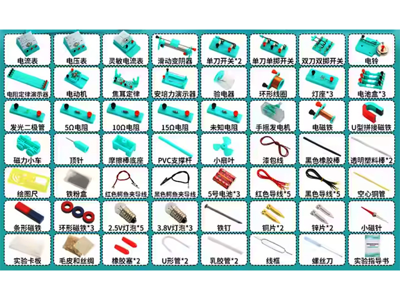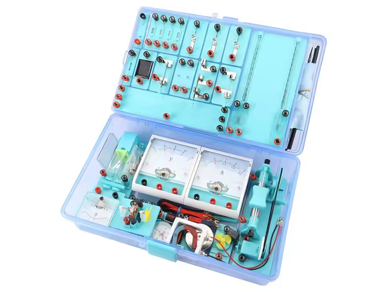 Componente: Voltmetru; Ampermetru, Bobină, Busolă; Pilitură de fier; Dulii (3); Întrerupător cu comutare dublă și singulară (2); Reostat cu mecanism de alunecare; Suport pentru 3 baterii AA; Rezistențe, diode luminiscente, becuri, fire de legătură, electroscop cu panglică, bare electrostatice, ace magnetice etc.