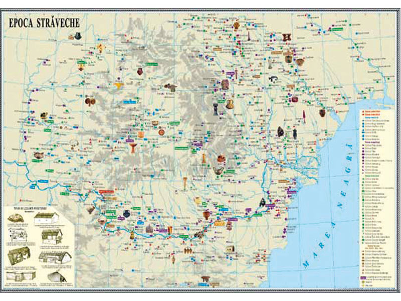 Harta reprezintă situaţia complexă a habitatului uman din spaţiul românesc în preistorie, ilustrată cu cele mai reprezentative vestigii arheologice.