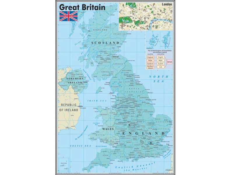 Harta Regatului Unit cu denumirile accentuate ale principalelor orașe și regiuni. Inserțiile din colțurile hărții conțin: drapelul Marii Britanii și planul or. Londra cu monumentele mai importante.
