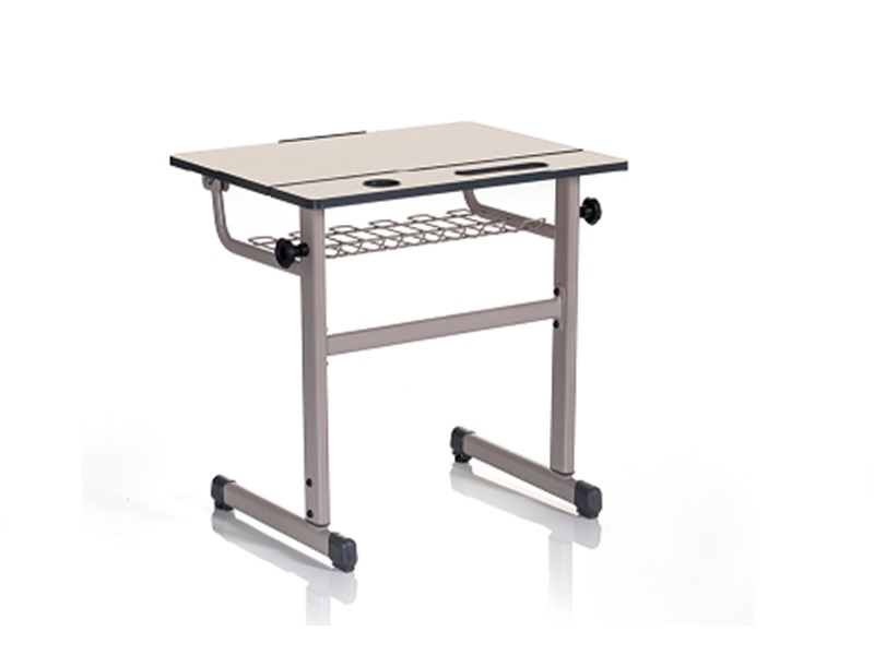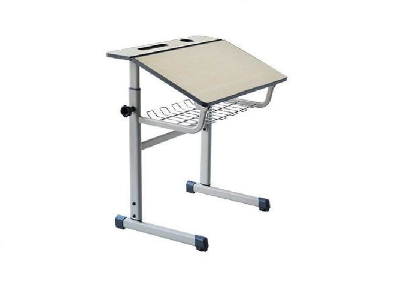 Blat: format din 2 segmente, unul cu suport pentru pixuri pozitionat pe orizontala, iar celalalt segment rabatabil (la dorință) cu un unghi de inclinare de max. 15º. Suprafața băncii este reglabilă pe înălțime și este executat din PAL melaminat de 20mm, pentru o utilizare intensivă. Blaturile sunt cantuite cu plastic dur prin injectie, utilizand procedeul de vacumare in matrita, conferind o mai mare rezistenta acestuia;
