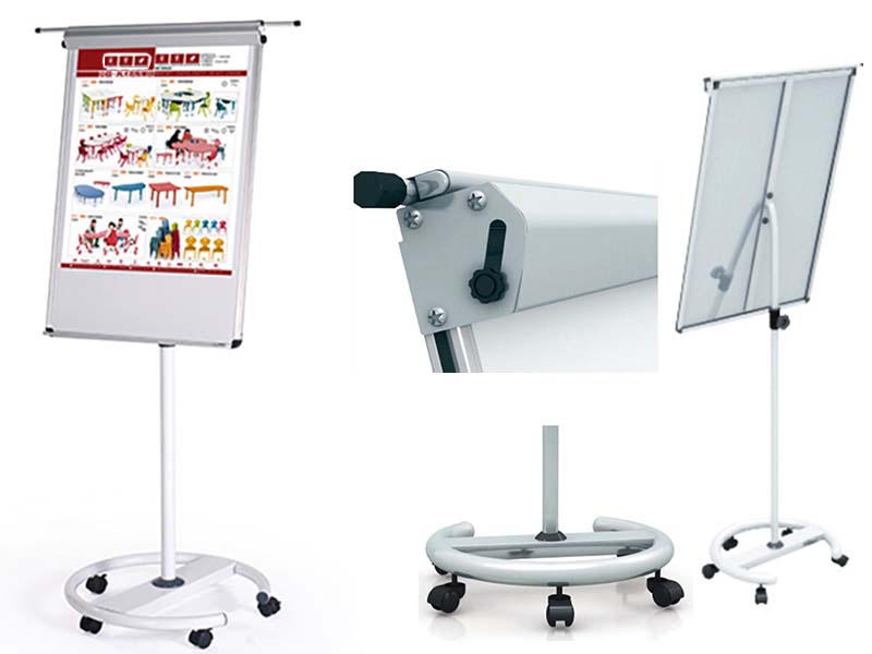 Suprafață magnetică pentru scriere cu dimensiuni 70×100 cm, suport pentru expunere materiale adiționale, brațe extensibile, suport pentru carioci și magneți. Design ergonomic, înălțime reglabilă, mobilitate asigurată de 5 rotile.
