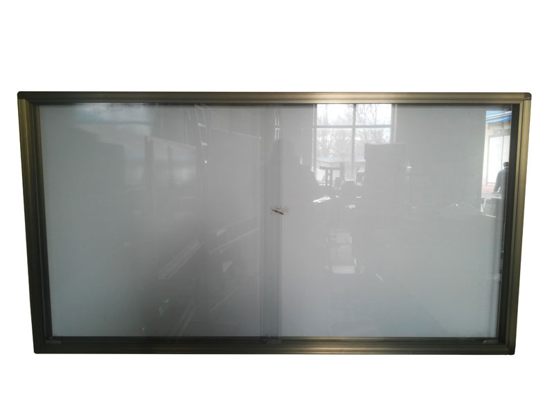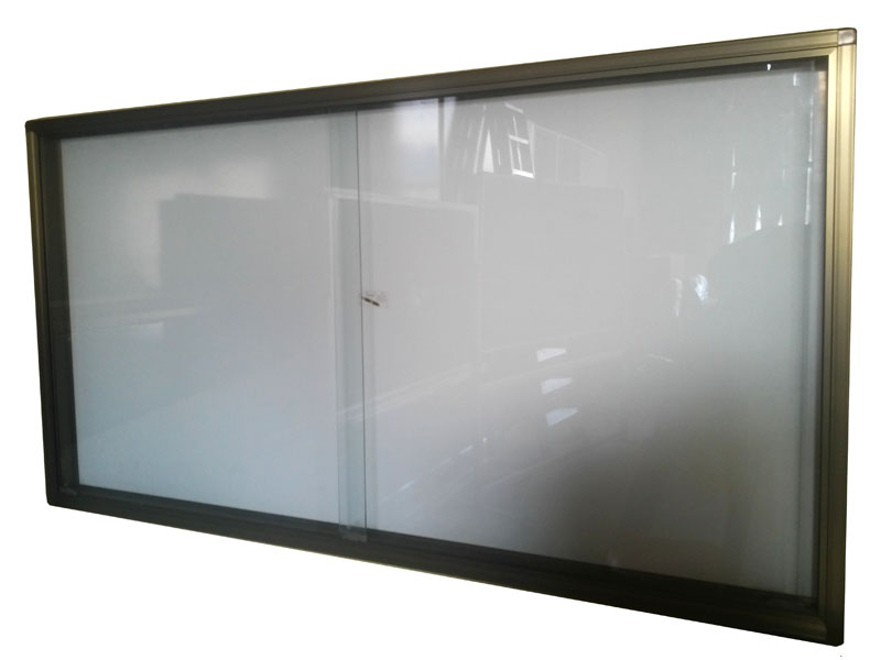 Partea frontală: sticlă organică culisantă pe sina interioara a ramei din aluminiu, cu colțare ABS, prevăzut pentru securizarea materialelor afișate.
