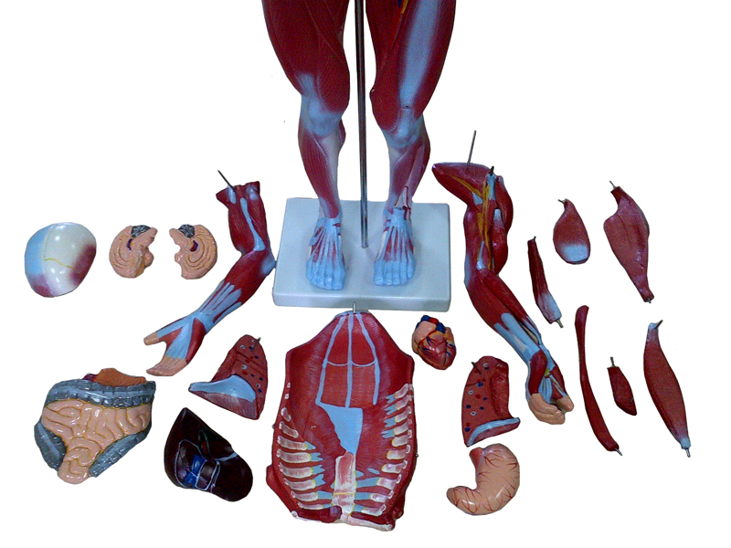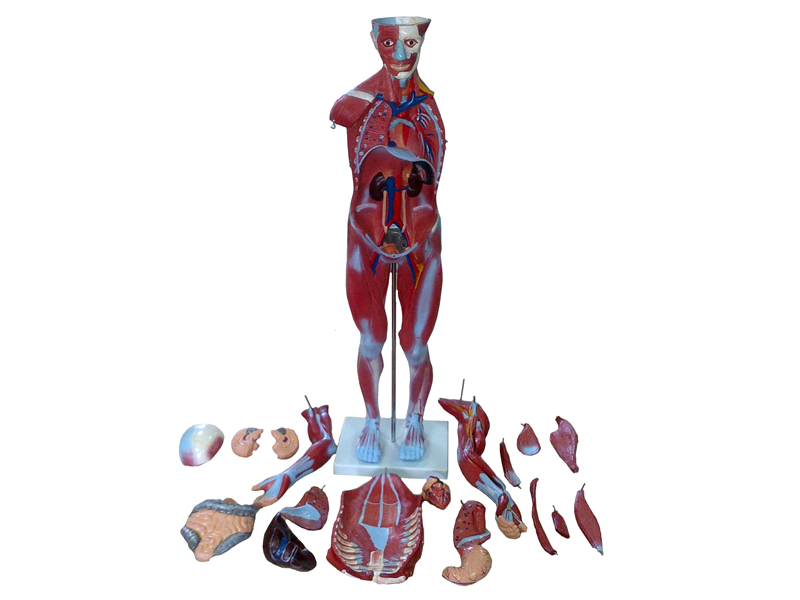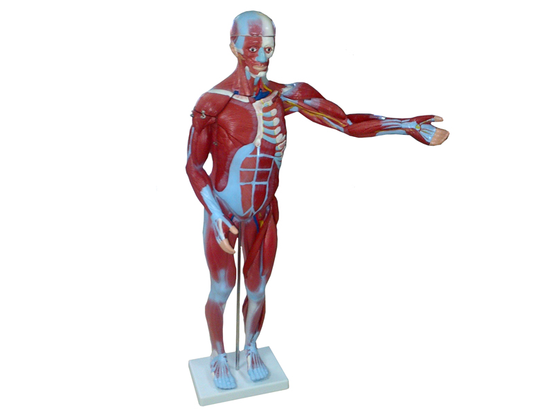 Modelul reproduce corpul uman, cu prezentarea detaliată a sistemului muscular, a celui nervos şi a organelor interne.