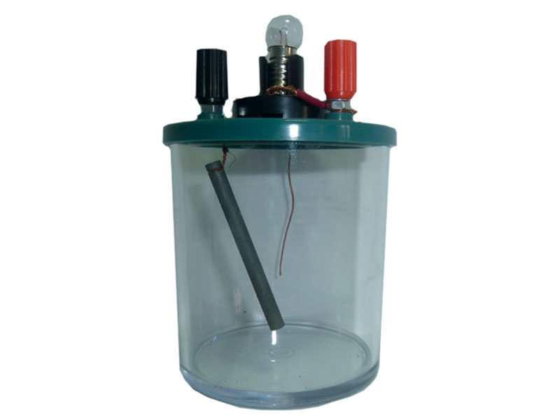 Vas pentru electroliză din plastic transparent cu volum 200 ml, cu capac cu doi electrozi, unul din cupru, iar altul din grafit cu diametrul 5 mm, cu contacte externe fixate pe capacul din plastic și bec cu filet 3,5 V.