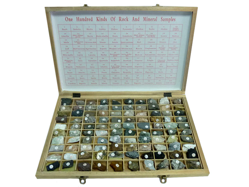 Setul cuprinde 100 de eșantioane de roci și minerale, din diferite zone a Terrei: grafit, galenă, sfalerit, Cinabru, Staniu, Molibden, pirită, cupru, fluorină, hematită, casiterit, cuarț, wolframit, magnetit, bauxită, talc, asbest, caolinit, muscovită, ortoclaz, calcit, dolomită, baritină, gips fibrilos, gips îngheþat, anhidrit, apatită, serpentină, gabro, bazalt etc. Fiecare specimen este enumerat. Ambalaj - cutie de lemn.