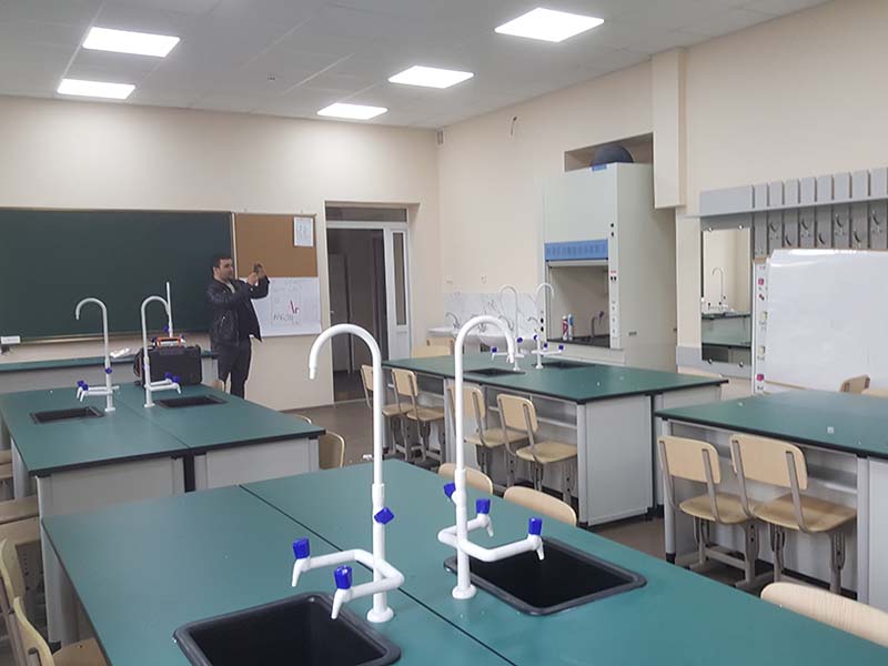 2. Laboratorul standard include: Modulul profesorului (la fizică cu sursă de tensiune, la chimie-bilogie – lavoar cu robinet specializat), 15 bănci duble – 30 locuri (la fizică cu panou de aparate electrice), 30 de scaune de laborator, 2-4 dulapuri de laborator și de păstrare a reactivelor și alte dotări la cerere (hotă de ventilare, mijloace de protecție etc.)
