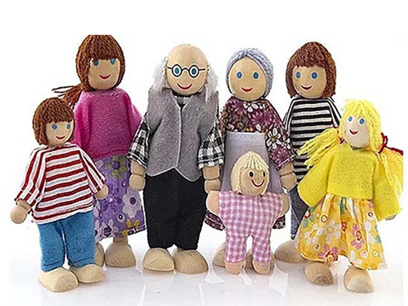 Set 7 figurine, reprezentând membrii familiei: mama, tata, bunica, bunelul, copil fetiță, copil băiat, bebeluș. Stabile în poziția verticală, cu trăsături ale feței definite prin desen. Material: lemn, accesorii de stofă, lână și plastic; Dimensiuni: înălțimea celui mai mic membru - 40 mm.